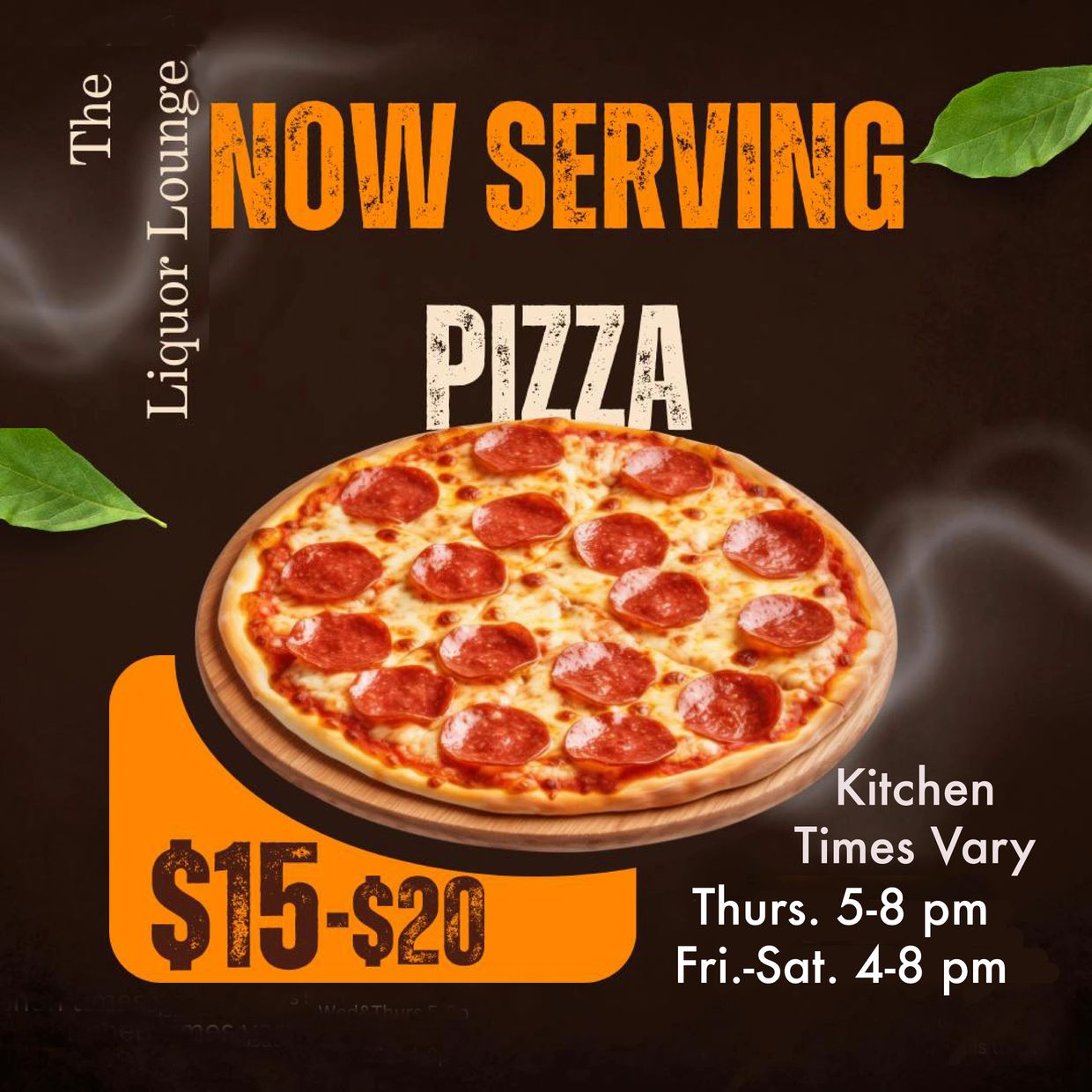 Stop in and try one of our delicious pizzas. They are baked on a ceramic stone to give you a crispy crust from start to finish! The Brisket, The Lounge, Deluxe, Sausage, Pepperoni and GF (cauliflower crust), GF will vary. Kitchen times vary for serving pizza: Thur. 5-8 pm; Fri.-Sat. 4-8 pm. Cheers!
